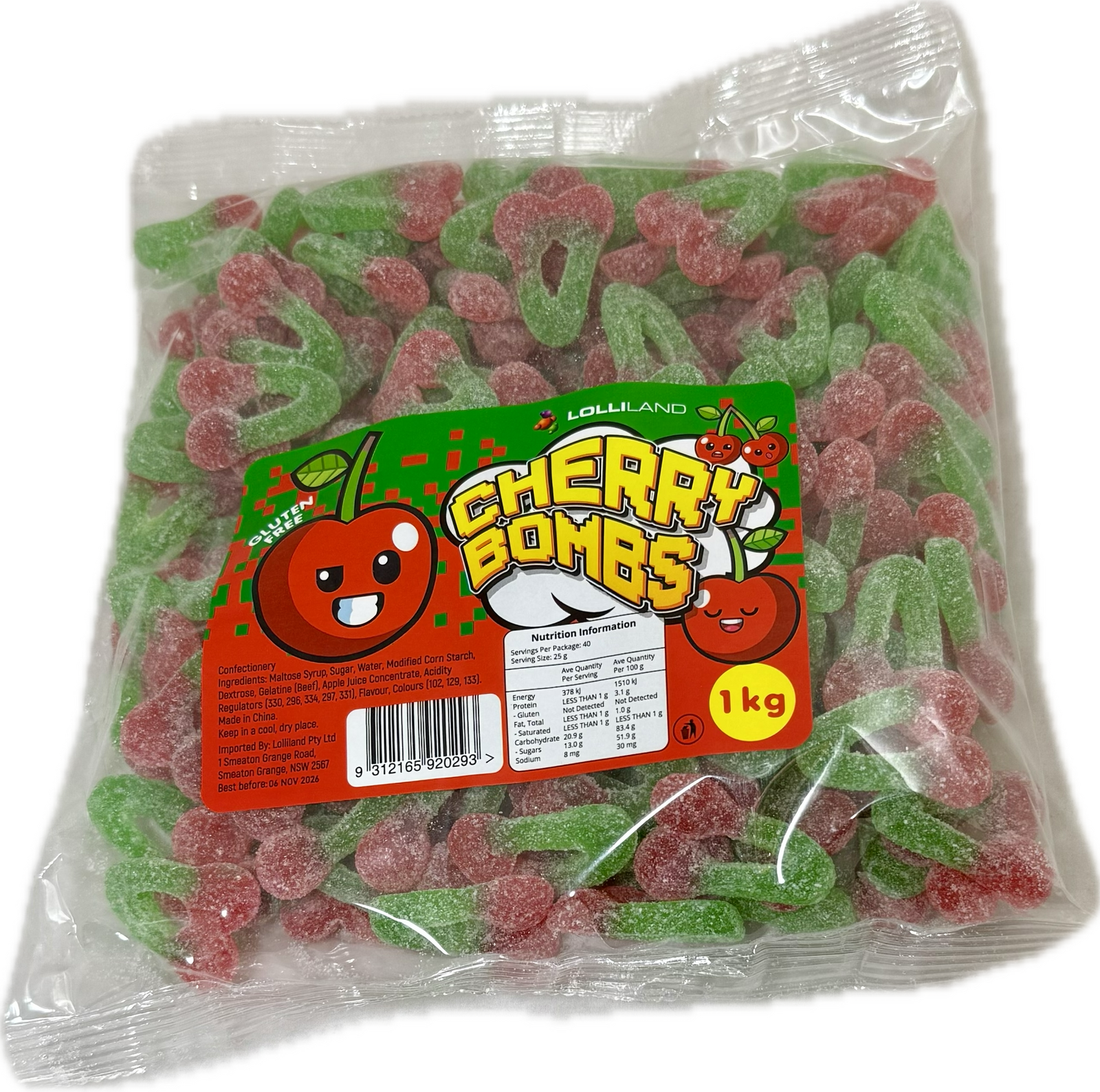 Our Gummi Sour Cherry Bombs- Gluten Free – 1kg is a favorite in gourmet foods for  bulk candy, sweet and sour gummies, cherry bomb candy, sweet cherry flavor, gummies for parties, gluten-free gummies, candy for events, chewy sweets, fruity sour candy, best sour gummies. Bursting with a bold sour punch and real cherry sweetness